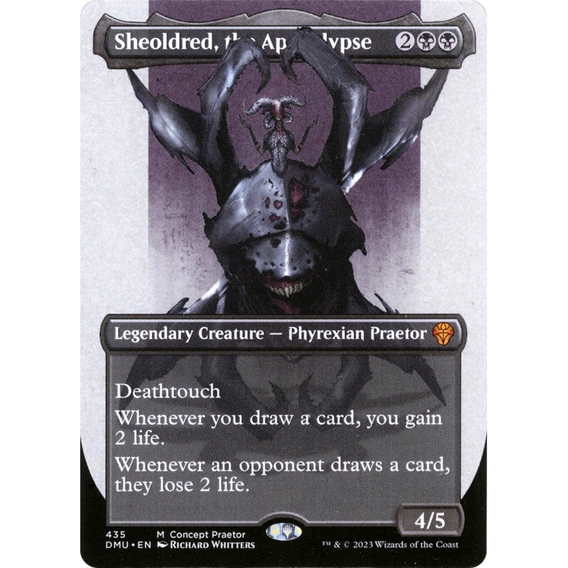 Set: Phyrexia: All Will Be One Type: Legendary Creature Phyrexian Praetor Rarity: Mythic Cost: {2}{B}{B} DeathtouchWhenever you draw a card, you gain 2 life.Whenever an opponent draws a card, they lose 2 life.